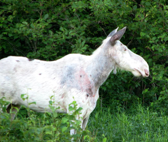 There have been at least half a dozen live national radio shows on the subject during the last 18 months. Radio and newspaper attention drew the focus of television companies, and the story was broadcasted to both French and English audiences, though I don't believe it extended beyond Northern Ontario. With so much media attention, the public began to demand the protection of these animals, but the Ministry of Natural Resources refused to take any action. Earlier correspondences with officials as high as the minister indicated that the organization would not protect the white moose strain, due to the belief that their genetically alterations rendered them less capable to survive in the wild. However, an older study performed by an MNR biologist proved that these animals have a similar life span to brown moose. Presumably, a white coat would not be a disadvantage during the warm summer months because carnivorous animals are hunting by scent. In addition, they would be less prone to disease by fly-bite as biting insects of the north are most attracted to the color black and least attracted to the color white. During the half dozen winter months when scent doesn’t carry, animals like wolves would be forced to hunt by sight alone, and a white coat would actually be an advantage. Also interestingly, photo's of the white moose from the spring months when the animals are molting (such as the one attached which was found at the MNR website) reveal that the animals have nearly black skin (similar to polar bears) under their white coats.